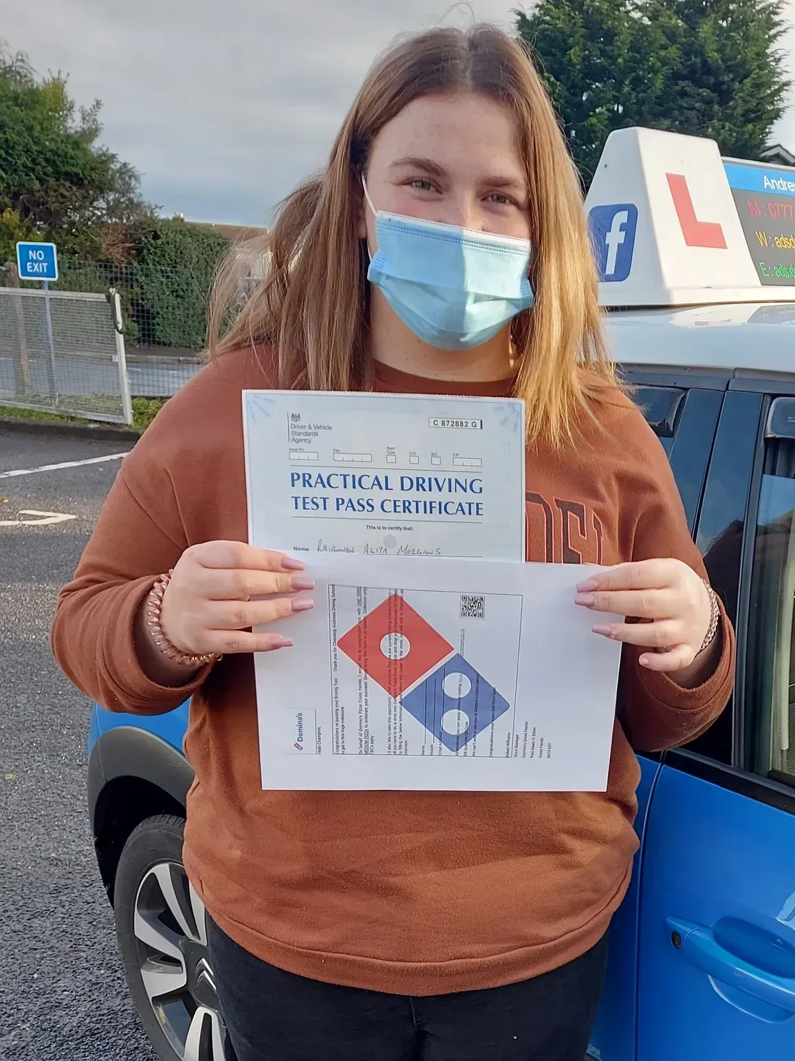 Megan Thomas. First time pass at Llanelli. Andrew was an excellent driving instructor. He helped to keep me calm in stressful situations by staying patient and reassuring me, he also kept me motivated and made my driving experience fun and enjoyable. Would highly recommend Andrew to anyone looking to learn to drive or improve their driving skills. Thank you Andrew!