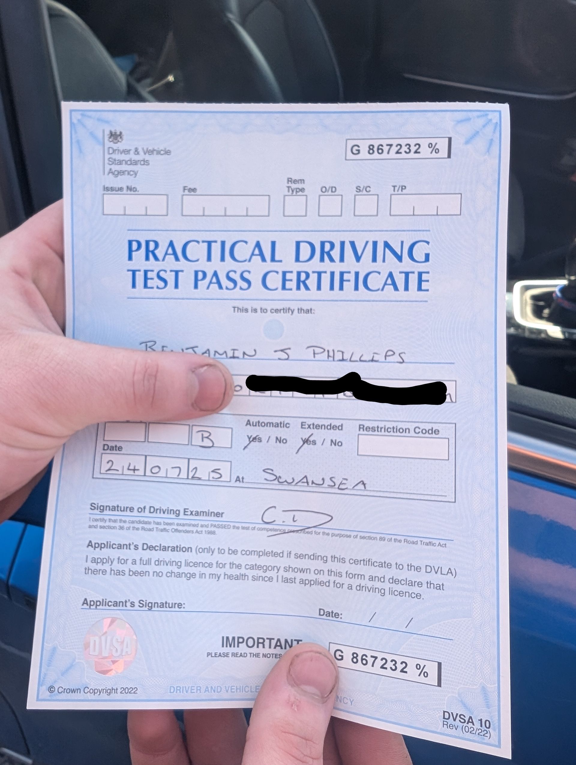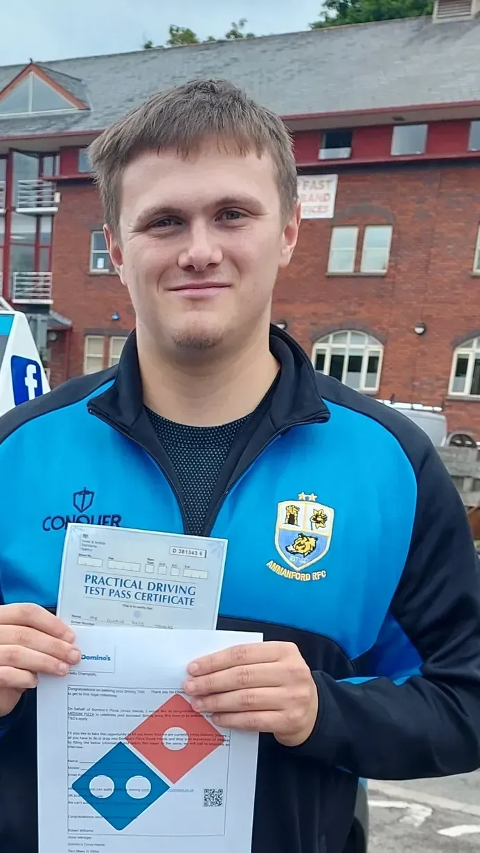 Louis Williams, passed first time in Carmarthen, on Friday 13th. We'll done buddy.