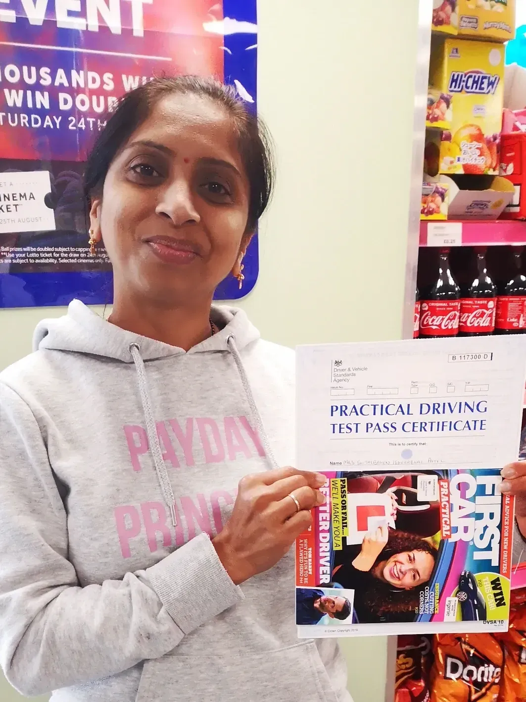 Mrs Shital Patel, (Mrs P). Brilliant pass in Carmarthen in terrible weather with only 3 minor faults.